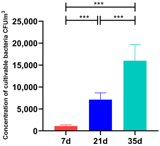 Concentration of cultivable airborne bacteria in broiler houses at different growth stages. *** p < 0.001.