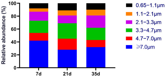 The particle size distribution of cultivable bacteria is shown in Figure 2. At 7 days of age, bacteria were predominantly associated with larger particles (≥4.7 µm), which accounted for 54.48% of the total, with the largest fraction (42.12%) found in Stage 1 (>7.0 µm). This suggests that in the early growth stage, bacteria are primarily carried by dust and manure particles. By day 21, the proportion of inhalable particles (<4.7 µm) increased to 56.35%, exceeding that of larger particles (43.65%) for the first time. Particles in the 3.3–4.7 µm range (Stage 3) reached their highest proportion (24.63%), indicating a shift towards smaller, respirable aerosols during the mid-stage. At 35 days, although the proportion of larger particles saw a slight increase to 42.71%, smaller particles remained dominant at 57.29%. Notably, the proportion of fine particles in the 2.1–3.3 µm range (Stage 4) increased to 19.35%, suggesting that near the harvest stage, a substantial fraction of bacteria existed as fine particles capable of deep respiratory tract penetration. This observation is particularly relevant from a health risk perspective, as fine particles can induce oxidative stress and inflammation in poultry and remain suspended in the air for long periods, thereby increasing the risk of inhalation by farm workers and potential zoonotic transmission. In summary, the particle size distribution shifted from a predominance of larger particles to smaller, more inhalable ones as the broilers aged, potentially increasing the risk of deep respiratory deposition.