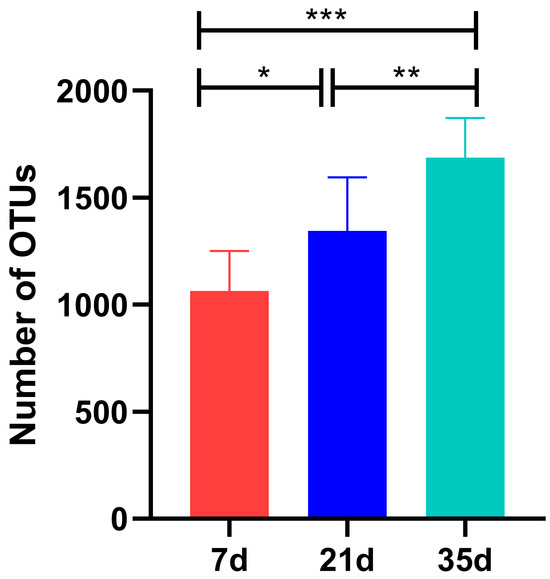A total of 9.54 × 104 high-quality sequences were obtained from all air samples after quality control. The number of observed OTUs for the different age groups is shown in Figure 3. The number of OTUs was 1.06 × 103 ± 1.87 × 102 at 7 days, which significantly increased to 1.34 × 103 ± 2.52 × 102 at 21 days (p < 0.05), and further to 1.69 × 103 ± 1.85 × 102 at 35 days (p < 0.01 compared to 21 days; p < 0.001 compared to 7 days). This progressive increase indicates a significant expansion of bacterial community richness with broiler age. Furthermore, the rarefaction curves for all samples approached a plateau, confirming that the sequencing depth was sufficient to capture the majority of microbial diversity and that the results are reliable and representative.
