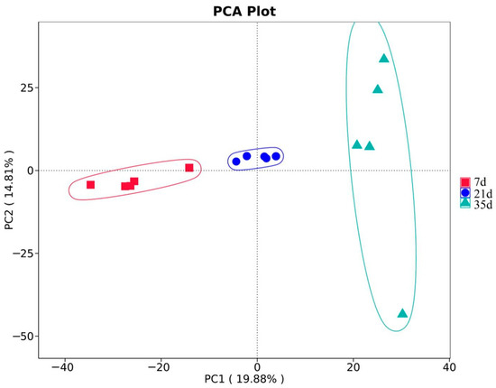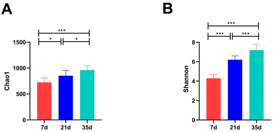 The α-diversity of the bacterial communities was assessed using the Chao1 (richness) and Shannon (diversity) indices (Figure 4A,B). The Chao1 index increased significantly from 725 ± 85 at day 7 to 852 ± 103 at day 21, and to 963 ± 88 at day 35 (p < 0.05 between all consecutive stages), indicating a continuous increase in species richness. Similarly, the Shannon index exhibited a highly significant increase from 4.3 ± 0.4 at day 7, to 6.2 ± 0.4 at day 21, and to 7.2 ± 0.6 at day 35 (p < 0.001 between all groups), demonstrating a substantial enhancement in community diversity and evenness as the broilers aged.