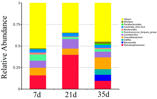 The composition of the airborne bacterial communities at the genus level is shown in Figure 6. The relative abundance of Stenotrophomonas was 16.12% at day 7, increased to 39.82% at day 21, and then decreased to 9.74% at day 35. Barnesiella and Delftia abundances gradually increased with age, reaching 6.93% and 6.57%, respectively, by day 35. Parasutterella exhibited a fluctuating trend, accounting for 8.76% at day 7, decreasing to 7.18% at day 21, and then increasing to 13.65% at day 35. Lactobacillus showed a peak abundance of 11.18% at day 21. Genera including Ruminococcus, Bacteroides, Parabacteroides, and Alloprevotella all demonstrated a pattern of initial decrease followed by an increase, reaching their highest abundances at day 35. The remaining bacterial taxa constituted 52.54%, 34.32%, and 44.84% of the communities at days 7, 21, and 35, respectively.