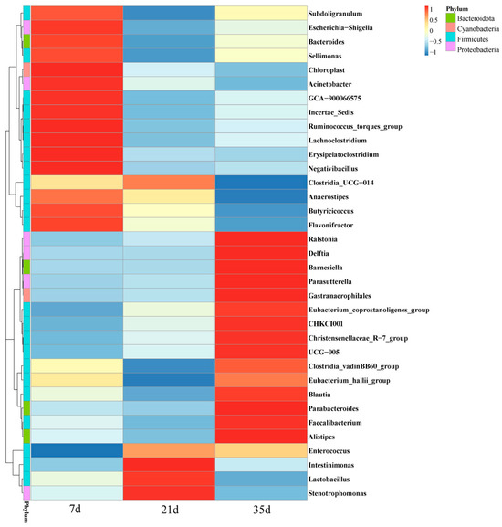 A heatmap analysis of the top 35 most abundant genera further highlighted significant shifts in the microbial community structure across growth stages (Figure 7). Notably, according to the “Pathogenic Microorganism Catalogue for Human Infectious Diseases” published by the National Health Commission of the People’s Republic of China, Shigella and Acinetobacter were detected in the bacterial community of the air in the cage broiler houses. Some strains of these genera are classified as human pathogens, suggesting that the winter environment in closed cage broiler houses may pose potential public health risks.