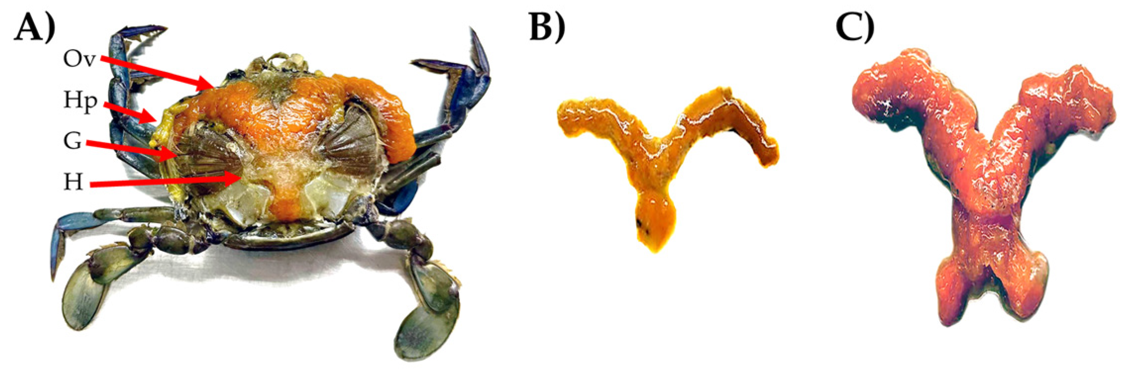 - Thongda, W.; Chung, J.S.; Tsutsui, N.; Zmora, N.; Katenta, A. Seasonal variations in reproductive activity of the blue crab, Callinectes sapidus: Vitellogenin expression and levels of vitellogenin in the hemolymph during ovarian development. Comp. Biochem. Physiol. A Mol. Integr. Physiol. 2015, 179, 35–43. [Google Scholar] [CrossRef] [PubMed]
