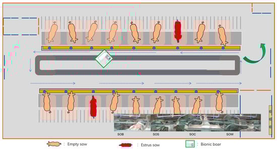 This study conducted behavior acquisition and robotic application experiments at three large-scale sow breeding farms in Shandong, Chongqing, and Shanxi from July 2019 to December 2020 and from December 2024 to August 2025. The experimental subjects were post-weaning sows with 2 to 3 parities. In total, 105 groups of sow behavior data were collected. Based on the ethological characteristics of estrus behavior, a bionic boar interaction device was designed and developed to intelligently detect the estrus state of sows. The device features a 1:1 scale 3D-printed boar head as its core structure, simulating key behaviors such as sniffing and physical contact commonly exhibited by boars during estrus detection. An ultrasonic module capable of controlled release of androstenone was integrated to enhance the sow’s neuro-endocrine response, thereby improving the stimulation effect and behavior response rate. The bionic boar device incorporates three simulation functions—sound, odor, and tactile feedback—and introduces a “contact window” mechanism to strengthen physical interaction, thereby promoting the natural expression of estrus behavior. It can actively simulate low-frequency vocalizations and olfactory cues of boars, and directionally release sex pheromones such as androstenone to induce typical behavioral responses in sows, including standing immobile, approaching, and exploratory actions. Based on these responses, combined with machine vision-based behavior recognition techniques, real-time perception and automatic identification of estrus behaviors in non-pregnant sows were achieved. Furthermore, a dynamic perception model of estrus state was constructed by analyzing behavioral responses under hormonal stimulation from the bionic boar. Interaction patterns between the sow and the device were also modeled and intelligently identified. Figure 1 provides an overview of the entire framework of this study. This approach enables precise determination of the estrus phase and assists in identifying the optimal timing for mating, thereby providing crucial support for the construction of an intelligent sow reproductive management system and significantly improving reproductive efficiency and the level of intelligent management.