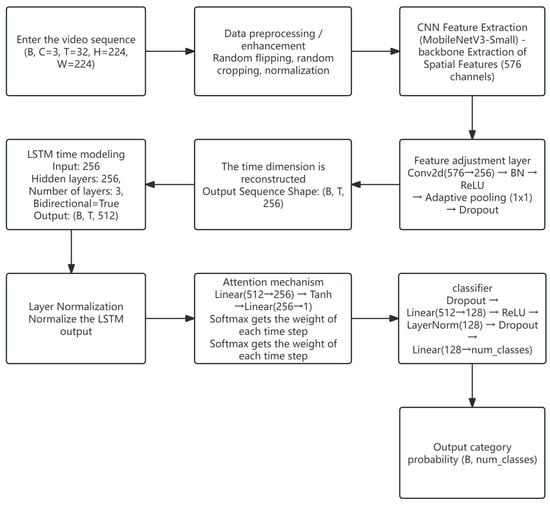 The model imposes a higher computational cost; compared to conventional CNNs, the LSTM introduces considerable time complexity, leading to prolonged training durations, especially in environments with limited GPU acceleration. Furthermore, the model’s responsiveness to short-duration, high-frequency behaviors is limited—LSTMs are better suited for modeling long temporal dependencies, and may underperform in capturing transient actions. Future improvements could consider integrating Temporal Convolutional Networks (TCN) or attention mechanisms to enhance the model’s sensitivity to instantaneous behaviors.