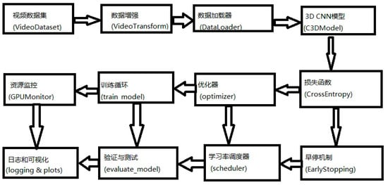 In addition, multiple data augmentation strategies are applied at the model input stage, including sliding window random clipping, temporal reversal, spatial flipping, and random cropping. During data loading, frame number completion and channel rearrangement are also implemented to ensure the generalization ability of video clips under varying scales, postures, and backgrounds. Figure 3 presents the framework of the 3D-CNN model for video data processing.