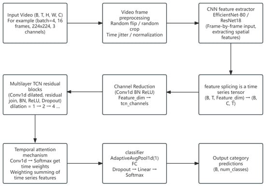 In the spatial feature extraction stage, the backbone network was configured as EfficientNet-B0 by default, while ResNet18 was additionally tested for comparison. The two networks output 1280- and 512-dimensional features, respectively, which were then compressed to 64 dimensions using a 1 × 1 convolution. Following the backbone CNN, a 1 × 1 convolutional channel compression layer is applied to reduce the frame-level feature dimension to 64, followed by BatchNorm and ReLU activation for spatial encoding. The temporal modeling component consists of multiple stacked TCN residual blocks. Each TCN residual block contains two dilated convolutions (with dilation rates of 1, 2, and 4), employs ReLU activation, and incorporates Dropout (0.2) along with residual connections to ensure effective information flow through deep layers. This structure enables the modeling of both short-term and long-term dependencies, making it suitable for multi-stage behavior modeling scenarios. After the TCN output, a lightweight temporal attention module is added, which utilizes 1D convolution and Softmax to learn the weight distribution over time steps, thereby achieving dynamic weighting of key behavior moments. For classification, the model applies adaptive average pooling to extract a global representation of the sequence, followed by Dropout (0.2), and a fully connected layer outputs the multi-class behavior prediction probabilities. The training process uses CrossEntropyLoss as the loss function and AdamW as the optimizer, with an initial learning rate of 1 × 10−4. The learning rate is dynamically adjusted using the ReduceLROnPlateau strategy, and early stopping is supported to prevent overfitting. In addition, the data augmentation pipeline integrates spatial random cropping, horizontal flipping, and temporal jittering to enhance the model’s adaptability to different sow postures and background environments. In practical testing, this model demonstrated good performance in recognizing standing and head-shaking behaviors, and its lightweight design and high deployability make it suitable for deployment on edge devices or embedded systems. Figure 4 presents the Overview diagram of the TCN model structure.