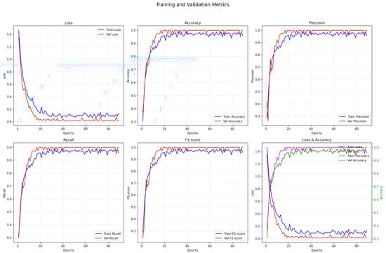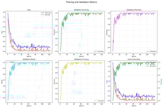 Figure 11 presents the key performance metrics of the CNN + TCN model over 120 training epochs, including training and validation loss, accuracy, precision, recall, and F1-score.