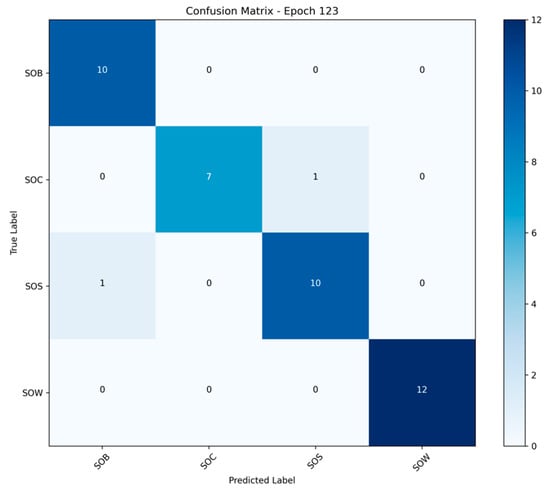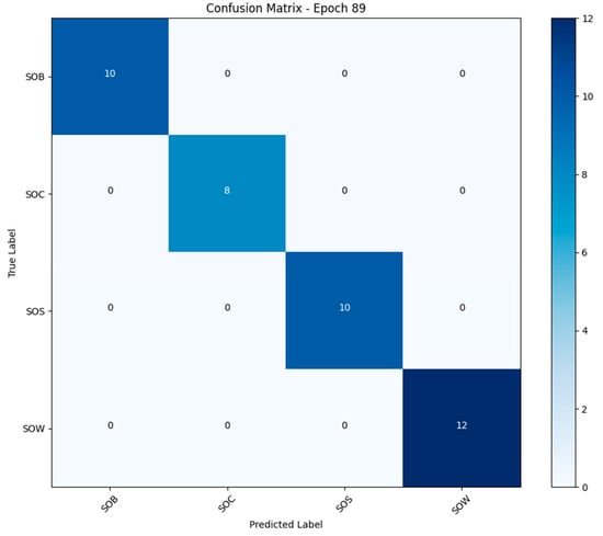 At the 89th epoch of training, the model’s classification results on the test set are shown in Figure 6. According to the confusion matrix, the model achieved 100% recognition accuracy for all four behavior categories (SOB, SOC, SOS, SOW), with no misclassified samples. Specifically, all 10 samples of the SOB class were correctly classified; all 8 samples of the SOC class were correctly classified; all 10 samples of the SOS class were correctly classified; and all 12 samples of the SOW class were correctly classified.