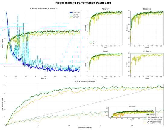 The model’s classification accuracy, stability, and generalization ability are comprehensively evaluated through the analysis of performance metric trends during training and validation, confusion matrix, and ROC curves.