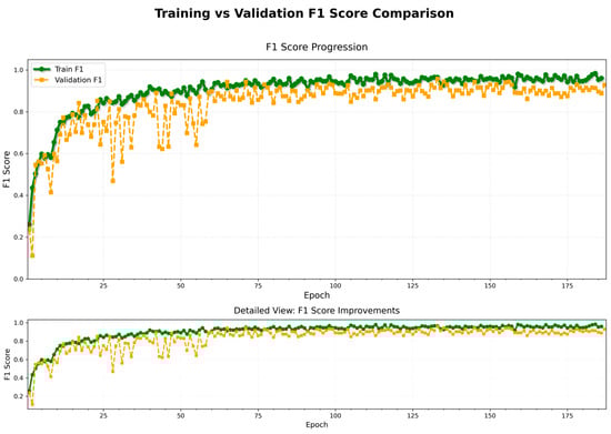 As illustrated in Figure 9, the F1-score progressively increased and converged during both the training and validation phases. The final F1-score on the training set stabilized at approximately 0.96, while the validation set maintained an F1-score above 0.91. This indicates that the model achieved a good balance between precision and recall, demonstrating stable and reliable recognition performance. A more detailed view further reveals that, with the increase in training epochs, the model exhibited a consistent improvement trend across all stages.
