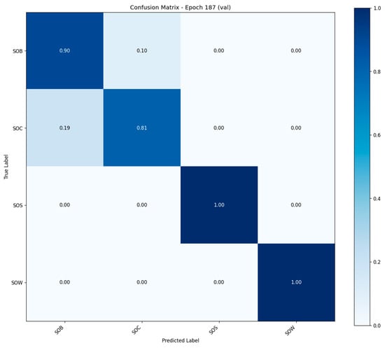 The model achieved 100% classification accuracy on the SOW and SOS behavior categories, indicating a strong discriminative ability for these behaviors with clear temporal features. The accuracy for SOB behaviors reached 90%, while that for SOC was 81%, with some degree of mutual misclassification observed between the two. Overall, the diagonal elements dominate the matrix, suggesting that the model exhibits high prediction accuracy across all behavior classes and maintains well-defined classification boundaries (Figure 10).