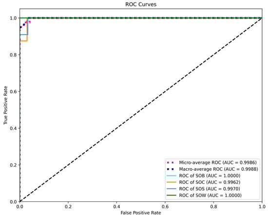 To further evaluate the model’s classification capability, ROC curves were plotted, and AUC values were calculated for the four behavior categories (Figure 7). Specifically, the micro-averaged ROC curve yielded an AUC of 0.9917, and the macro-averaged ROC curve achieved an AUC of 0.9965. All individual categories attained AUC values exceeding 0.98, with the SOW category reaching 1.0000, demonstrating outstanding performance. As shown in this figure, the ROC curves for all categories closely approach the top-left corner, indicating excellent discrimination between positive and negative samples and reflecting high classifier reliability. Notably, the perfect AUC score of the SOW category suggests that its behavioral features were thoroughly learned by the network.