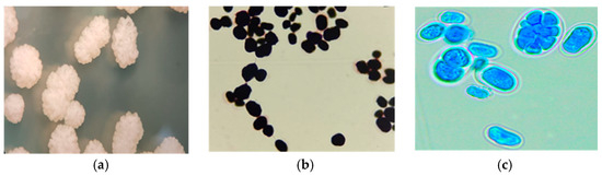 The identification of positive Prototheca culture was initially achieved based on the macroscopic characteristics of the colonies observed under a stereomicroscope, as well as microscopic observations of the cells using Gram-staining and wet mount preparation with lactophenol [28]. The macroscopic examination revealed colonies with irregular morphology, whitish coloration, shiny appearance, pronounced elevation, wavy edge, and granular surface (mulberry or cauliflower-like) (Figure 1a). The microscopic evaluation showed oval, spherical, or reniform structures, individual cells or small groups stained purple with Gram-staining (internal structures are not evidenced) (Figure 1b) and blue in wet preparation with lactophenol, showing sporangial-type cells (characteristic of Prototheca) containing 2 to 8 or more sporangiospores and an evident cell wall (Figure 1c).