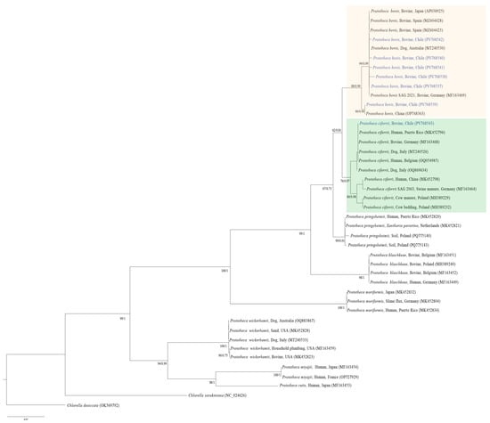 To identify Prototheca spp. at the level of species, a PCR was performed as previously described by [11]. Briefly, a partial fragment (644 bp) of the cytb gene was amplified using the primers cytb_F1 (5′-GYGTWGAACAYATTATGAGAG-3′) and cytb_R2 (5′-WACCCATAARAARTACCATTCWGG-3′) in a reaction mixture (50 μL) containing 25 μL of Promega GoTaq® DNA polymerase (Promega, Madison, WI, USA), 0.2 μM of each primer, 18 μL of Milli-Q ultrapure water, and 5 μL of template DNA, under the thermal protocol consisting of: initial denaturation at 95 °C for 3 min followed by 35 cycles of denaturation at 95 °C for 30 s, annealing at 50 °C for 30 s, and extension at 72 °C for 30 s, with a final extension at 72 °C for 5 m in a SureCycler 8800 thermocycler (Agilent, Santa Clara, CA 95051, USA) [11,13]. PCR products were visualized by electrophoresis on 1% (w/v) agarose gel stained with SYBR Safe (Invitrogen, Carlsbad, CA 92008, USA). The amplicons were sent for purification and sequencing to Macrogen Chile (Santiago, Chile), where they were sequenced by the Sanger method in both directions using the same PCR primers.