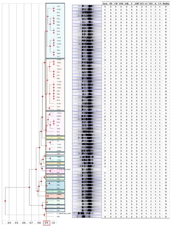 Dendrogram obtained from the amplification profiles generated with the OPA-4 primer, using the Unweighted Pair Group Method with Arithmetic Mean (UPGMA). Strains with a similar coefficient equal to or greater than 90% can be considered genotypically identical (clustered within the same color) [24]. The analysis includes the Prototheca isolates studied, along with the reference strains Prototheca bovis SAG 2021T and Prototheca ciferrii SAG 2063T. The information for each isolate is indicated: farm, susceptibility (R: resistant and S: susceptible) to tested antibiotic (MY: lincomycin, CIP: ciprofloxacin, ENR: enrofloxacin, AML: amoxicillin, P: penicillin, AMP: ampicillin, SXT: sulfamethoxazole/trimethoprim, CT: colistin sulfate, NET: netilmicin, K: kanamycin, CN: gentamicin) and biofilm production (W: weak; M: moderate; N: nonproduction).