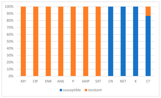 All isolates showed resistance to lincomycin (MY), ciprofloxacin (CIP), enrofloxacin (ENR), amoxicillin (AML), penicillin (P), ampicillin (AMP), and sulfamethoxazole/trimethoprim (SXT), with no inhibition zones observed (inhibition diameter = 0 mm). Conversely, gentamicin (CN), netilmicin (NET), and kanamycin (K) exhibited the highest antimicrobial activity, with all strains classified as susceptible. Colistin sulfate (CT) showed variable activity, with 13.24% (9/68) of the isolate exhibiting resistance. No intermediate susceptibility was observed for any of the antibiotics tested (Figure 4). The antibiotic susceptibility results of the isolates appeared independent of their RAPD-genotype or farm origin. The individualized antibiotic susceptibility outcomes by isolate are detailed in Figure 3.
