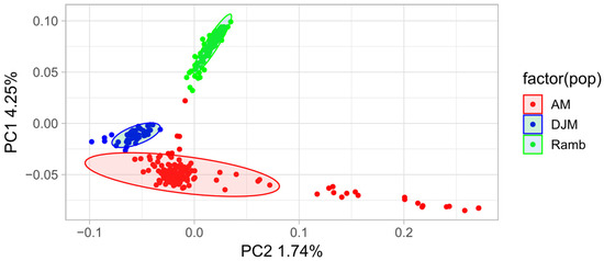According to the PCA results, Rambouillet and Dzhalgin Merino are presented as well-consolidated clusters, while AM showed greater intrabreed genetic variability compared to DZM and Ramb (Figure 1). In the PCA analysis, PC1 (the first principal component) accounted for 4.25% of the total genetic variability, separating all three analyzed groups of sheep, while PC2 (the second principal component) represented only 1.74% of the total genetic variability.