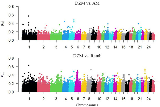 Manhattan plot of fixation index values used to identify genomic regions under selection pressure in comparisons between Dzhalginsky Merino and Australian Merino (DZM vs. AM), and between Dzhalginsky Merino and Rambouillet (DZM vs. Ramb). The horizontal blue line marks the 99th percentile of the FST values, representing the threshold for regions considered to be under selection pressure.