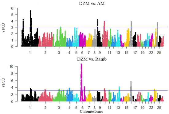 Manhattan plot of VarLD values illustrating genomic regions with differences in linkage disequilibrium patterns between Dzhalginsky Merino and Australian Merino (DZM vs. AM), and between Dzhalginsky Merino and Rambouillet (DZM vs. Ramb). The horizontal blue line marks the 99th percentile of the VarLD values, representing the threshold for regions considered to be under selection pressure.