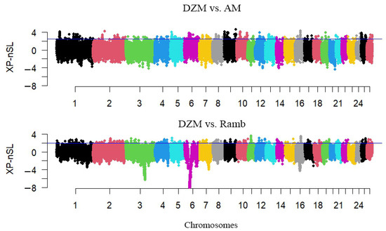 Manhattan plot of xp-nSL scores used to detect selection signatures in the Dzhalgin Merino in comparison with Australian Merino (DZM vs. AM) and Rambouillet (DZM vs. Ramb) sheep groups. The horizontal blue line marks the 99th percentile of the xp-nSL values, representing the threshold for regions considered to be under selection pressure.