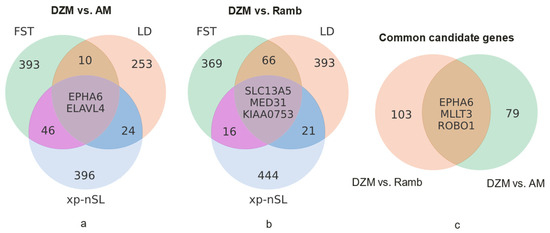 Overlapping genes at loci under selection pressure identified by different methods in comparative analysis of the genomes of Dzhalgin Merino and Australian Merino (a), Dzhalgin Merino and Rambouillet (b), as well as genes selected for further analysis and common to the candidate gene networks “DZM vs. AM” and “DZM vs. Ramb” (c).