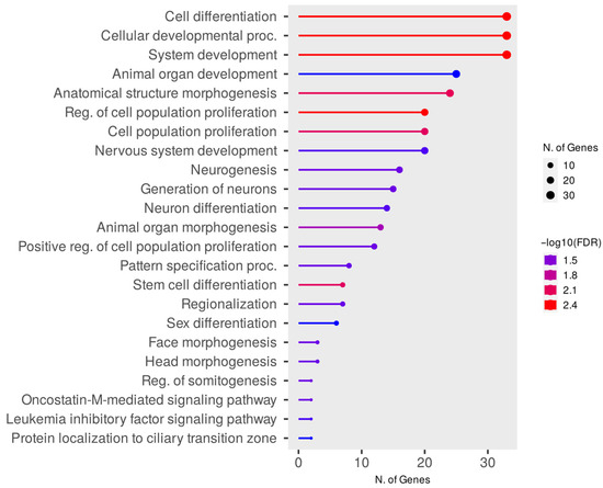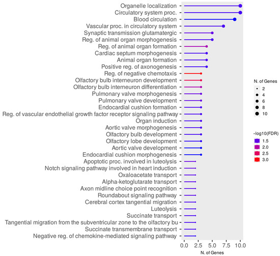 Significant enrichments for the DZM vs. Ramb network were identified for 38 Gene Ontology terms of biological functions (Figure 8, Supplementary Table S5) and 1 term of cellular components (Supplementary Table S6). A total of 29 genes from the DZM vs. Ramb group are involved in the enriched pathways of biological processes. The ROBO1 gene is involved in 26 terms, ROBO2 is involved in 24, and SLIT2 in 20. The largest number of genes are involved in the GO:0051640 organelle localization and GO:0003013 circulatory system process pathways. The lowest FDR value (0.0009) was determined for the GO:0050923 reg. of the negative chemotaxis pathway.