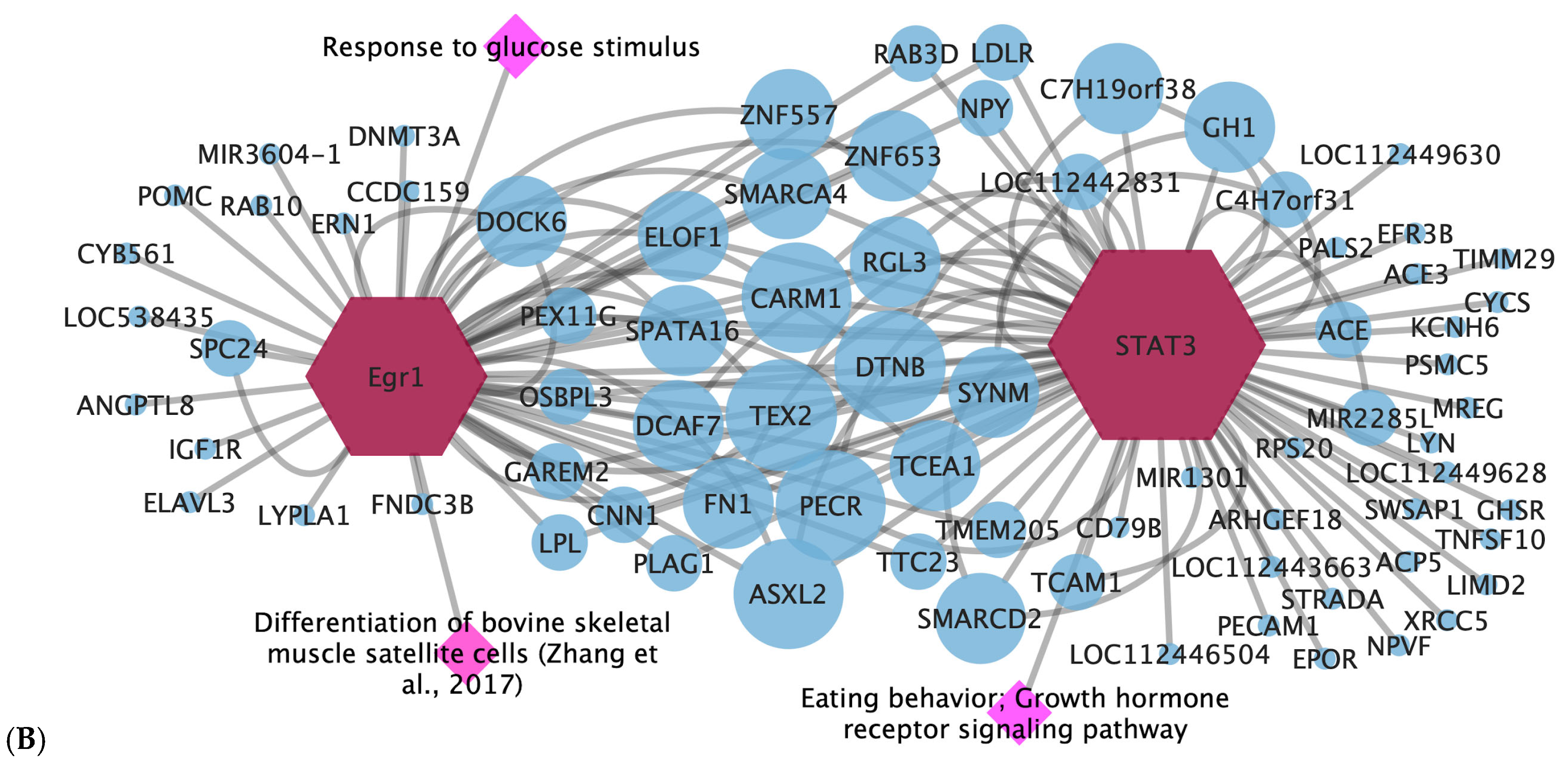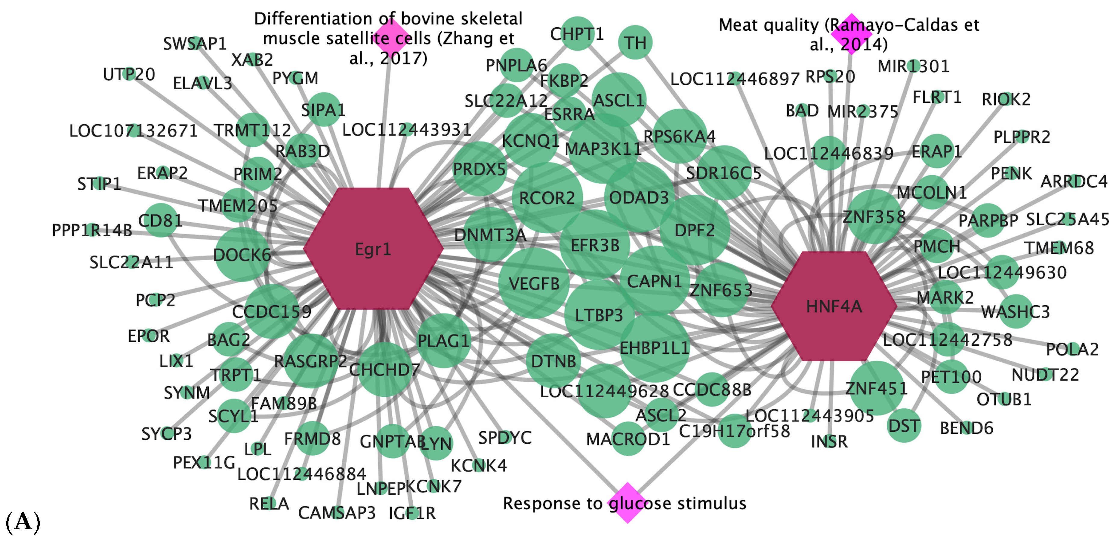 - Ramayo-Caldas, Y.; Fortes, M.R.S.; Hudson, N.J.; Porto-Neto, L.R.; Bolormaa, S.; Barendse, W.; Kelly, M.; Moore, S.S.; Goddard, M.E.; Lehnert, S.A.; et al. A Marker-Derived Gene Network Reveals the Regulatory Role of PPARGC1A, HNF4G, and FOXP3 in Intramuscular Fat Deposition of Beef Cattle1. J. Anim. Sci. 2014, 92, 2832–2845. [Google Scholar] [CrossRef] [PubMed]