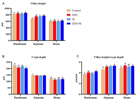 In the jejunal segment, the villus height and the V/C ratio in all experimental groups were significantly increased compared with those in the Control group (p < 0.05). Moreover, the villus height in the EEO + SI group was significantly higher than that in the SI group (p < 0.05).