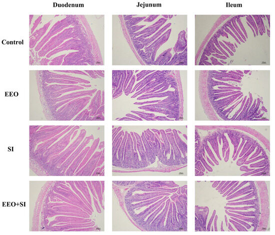The effects of individual or combined dietary supplementation with EEO and SI on small intestinal morphology are illustrated in Figure 1 and Figure 2. In the duodenal segment, the villus height in the EEO + SI group was significantly higher than that in the Control group and the SI group (p < 0.05). Moreover, the crypt depth in the EEO + SI group was significantly lower than that in the Control group and SI group (p < 0.05). The V/C ratio in both the EEO group and EEO + SI group was significantly higher than that in the Control group (p < 0.05), and the V/C ratio in the EEO + SI group was significantly higher than that in the SI group (p < 0.05).