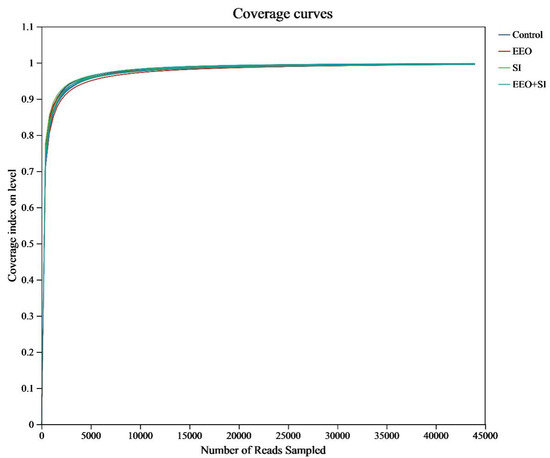 Cecal digesta were aseptically collected for microbial total DNA extraction using SDS-based lysis buffer coupled with proteinase K digestion. The hypervariable V3–V4 region of the 16S rRNA gene was amplified using the fusion primers 338F (5′-ACTCCTACGGGAGGCAGCAG-3′) and 806R (5′-GGACTACHVGGGTATCTA AT-3′) PCR amplicons underwent size selection and purification via the AMPure XP magnetic bead system (Thermo Fisher Scientific, Waltham, MA, USA). Sequencing libraries were prepared and subjected to high-throughput sequencing on an Illumina platform (Illumina, San Diego, CA, USA). The raw sequencing data underwent preliminary quality screening based on Phred scores (Q ≥ 30), with problematic samples being re-sequenced. Primer sequences were trimmed using Cutadapt (v3.5), and reads with mismatched primers were discarded. Subsequent processing employed the DADA2 pipeline (v1.22.0) in QIIME (2022.2 release) for quality control, denoising, paired-end merging, and chimera removal [17]. Rarefaction curves were generated using the coverage index derived from alpha diversity analysis to assess whether sequencing depth sufficiently captured the full taxonomic diversity of samples and to validate the rationality of sequencing data. Alpha diversity metrics, including the Shannon index, Simpson index, Chao1 richness estimator, Ace richness estimator, and observed richness (Sob), were calculated from the OTU abundance table to quantify microbial community diversity and species richness. Furthermore, beta diversity was estimated by calculating Bray–Curtis dissimilarity distances between the experimental groups and controls.