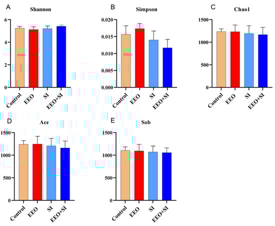 The alpha diversity metrics indicated no significant differences among the treatment groups (Figure 4A–E; p > 0.05), demonstrating that dietary interference did not alter the alpha diversity.