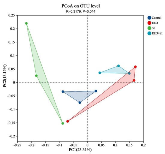 The two principal coordinates (PC1 and PC2) accounted for 23.31% and 13.15% of the total variance, respectively. Distinct clustering patterns were observed between all treatment groups and the Control group, indicating statistically significant differences in microbial community structure (Figure 5, R = 0.3179, p = 0.044).
