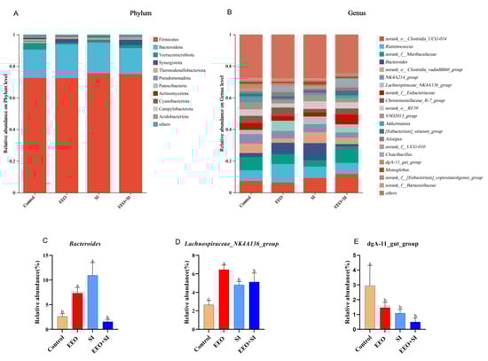 The effects of dietary supplementation with eucalyptus essential oil and soy isoflavones on the morphology of the microbiota of meat rabbits at the end of the experiment (n = 3 per group). The relative abundances of bacterial communities at the (A) phylum level and (B) genus level, including (C) Bacteroides, (D) Lachnospiraceae_NK4A136_group and (E) dgA-11_gut_group. a,b Mean values with different letters are significantly different (p < 0.05).