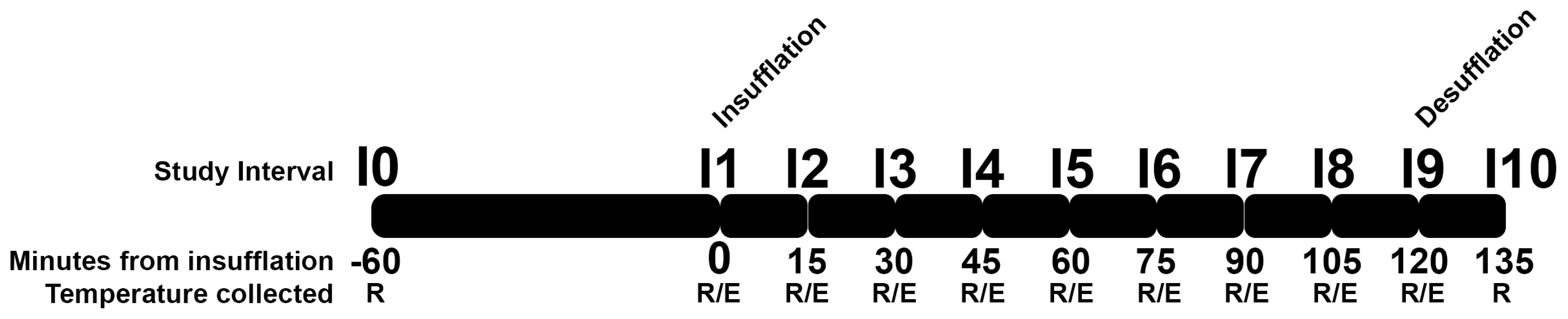 - Noll, E.; Diemunsch, S.; Pottecher, J.; Rameaux, J.P.; Diana, M.; Sauleau, E.; Ruetzler, K.; Diemunsch, P. Prevention of laparoscopic surgery induced hypothermia with warmed humidified insufflation: Is the experimental combination of a warming blanket synergistic? PLoS ONE 2018, 13, e0199369. [Google Scholar] [CrossRef] [PubMed]