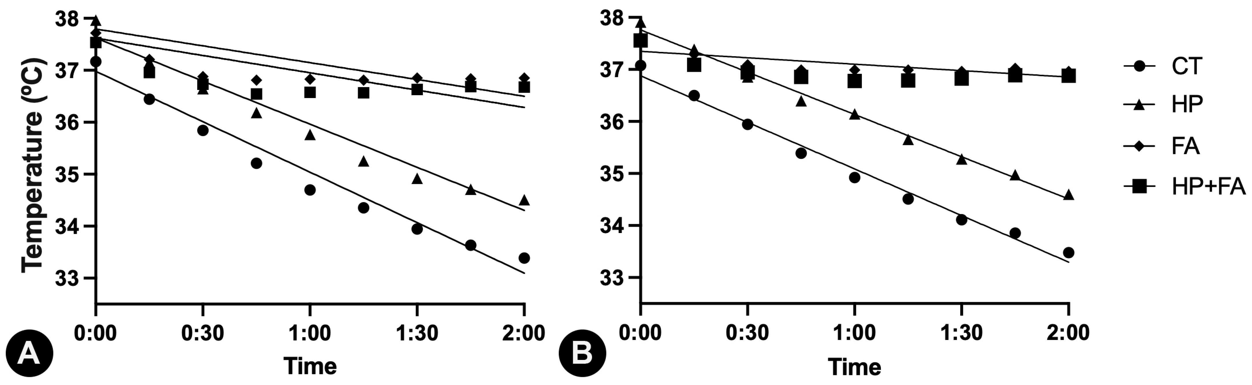 Time (min) × Rectal temperature (°C) | 0.9818 | <0.0001 | 0.9782 | <0.0001 | 0.6249 | 0.0019 | 0.5966 | 0.0027 |