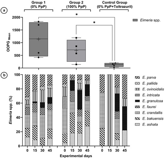 Parasitic dynamics of Eimeria spp. in sheep fed Parkia platycephala pods. (a) Mean oocyst counts per gram of feces (OOPG) by experimental group. Raw OOPG values: Group 1 = 1138 ± 645, Group 2 = 693 ± 450 and Control Group = 130 ± 37. Asterisks indicate significant differences (p < 0.05) between groups by Tukey’s test. (b) Percentage composition of Eimeria species throughout the experimental period (days 0, 15, 30, and 45). G1: 0% Parkia platycephala pods without anticoccidial; G2: 100% Parkia platycephala pods without anticoccidial; Control Group: 0% Parkia platycephala pods + toltrazuril.