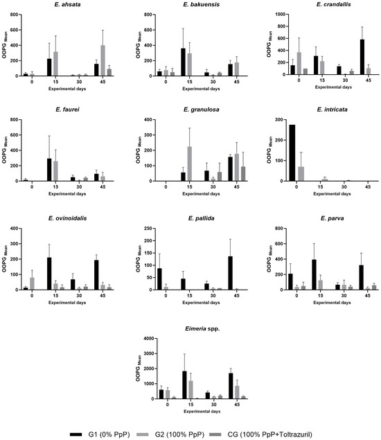 Temporal dynamics of Eimeria species by experimental group. Data presented as mean OOPG values for nine identified species plus total Eimeria spp. counts throughout experimental days (0, 15, 30, 45). Bars represent mean ± standard error. G1: black (0% PpP); G2: dark gray (100% PpP); CG: light gray (control + toltrazuril). Ten panels show: individual species (E. ashata, E. bakuensis, E. crandallis, E. faurei, E. granulosa, E. intricata, E. ovinoidalis, E. pallida, E. parva) and total Eimeria spp. burden. Bars represent mean ± standard error.