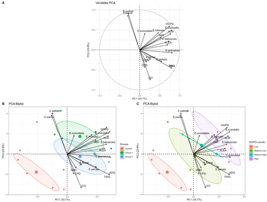 Principal component analysis (PCA) integrating parasitological and productive parameters. (A) Correlation circle showing the contribution of each variable to principal components 1 and 2. (B) Individual biplot colored by experimental group. (C) Individual biplot colored by OOPG levels, evidencing animal separation according to parasitic load. PC1 and PC2 explain 33.7% and 23.8% of total variance, respectively.