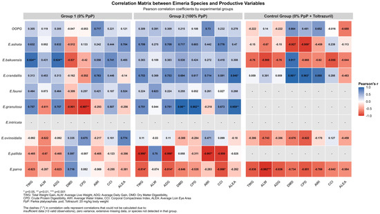 Pearson correlation matrix between Eimeria species and productive variables by experimental group. Correlation coefficients represented by color intensity: blue indicates positive correlations, red indicates negative correlations. Asterisks indicate statistical significance: * p < 0.05, ** p < 0.01, *** p < 0.001. TWG: total weight gain; ALW: average live weight; ADG: average daily gain; DMD: dry matter digestibility; CPD: crude protein digestibility; AWI: average water intake; CCI: body compactness index; ALEA: average loin eye area.