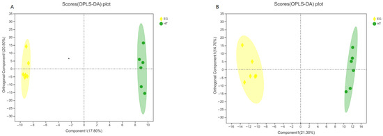 OPLS-DA score plots of metabolite profiles in broilers from the heat stress (HT) and 400 µg Cr/kg (EG) groups. (A) Positive ionization mode; (B) Negative ionization mode. Yellow represents the EG group, and green represents the HT group. Distinct clustering indicates metabolic differences between treatments.