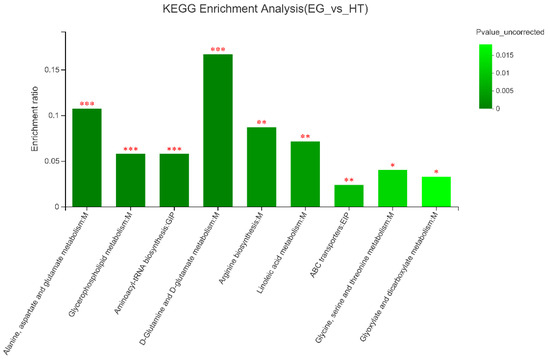 Pathway enrichment of the identified metabolites in broilers from the heat stress (HS) group and the 400 µg Cr/kg supplementation (EG) group. The x-axis means the pathway, while the y-axis represents the enrichment ratio, defined as the proportion of pathway-enriched metabolites to the total metabolites associated with that pathway. A higher enrichment rate signifies a greater degree of enrichment. The color gradient of the bars represents the significance of enrichment, and the dark color bars indicate more significant enrichment of the KEGG term. Statistical significance was determined based on p-values adjusted by FDR correction. Symbols denote the following: p-value < 0.001 is marked as ***, p-value < 0.01 is marked as **, and p-value < 0.05 is marked as *.