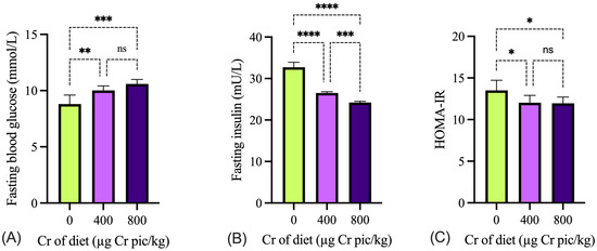 Effects of chromium picolinate supplementation on blood glucose (A), insulin (B) and HOMA-IR (C) in broilers under heat stress. Cr pic = chromium picolinate. Values are expressed as mean ± SD (n = 6). ns, not significant; * p < 0.05; ** p < 0.01; *** p < 0.001; **** p < 0.0001.