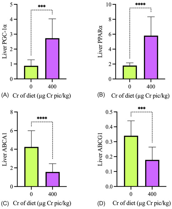 Effects of chromium supplementation on the mRNA expression of genes involved in glycolipid metabolism in the liver of heat-stressed broilers. The relative expression levels of PGC-1α (A), PPARα (B), ABCA1 (C), and ABCG1 (D) are shown. Cr pic = chromium picolinate. Values are expressed as mean ± SEM. *** p < 0.001; **** p < 0.0001.