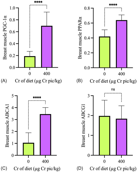 As shown in Figure 4, the expression of PGC-1α, PPARα, ABCA1, and ABCG1 in the liver in the 400 µg Cr/kg group was significantly higher than in the HS group (p < 0.05). As shown in Figure 5, the expression of PGC-1α, PPARα, ABCA1, and ABCG1 mRNA in breast muscle in the 400 µg Cr/kg group was significantly higher than in the HS group (p < 0.05), whereas there was no significant difference in ABCG1 in the breast muscle between the two groups (p > 0.05).