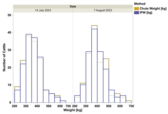 Histograms of body weights collected on 14 July 2023 or 7 August 2023 using either the chute scale (Chute) or the Vytelle In-Pen Weighing (IPW) Positions.