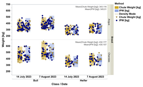 Distribution of chute (gold) and IPW (blue) weights (kg) in Angus and Charolais bulls and heifers on two occasions. The dots represent actual weights of individual animals, and the boxes contour the spread of weighing method data. Within each method (color), the dark region marks 50% and the whole box represents 99% probability density. The horizontal line in each box is the mode. Noticeable are the similarities in the high-density regions between the weighing methods. Considering the impact of breeds, class, and growth in repeated measures ANOVA on body weight, there was no main effect of weighing method detected (p = 0.52).
