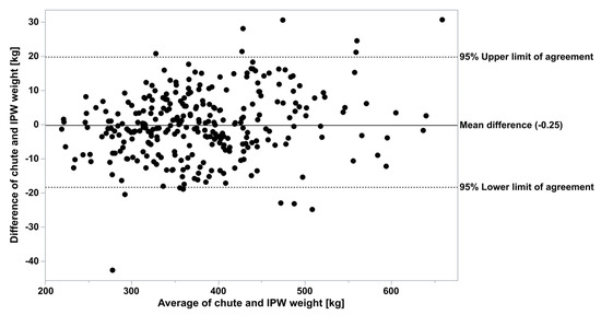 Bland–Altman plot of body weights measured with the chute scale or the Vytelle In-Pen Weighing (IPW) Positions.