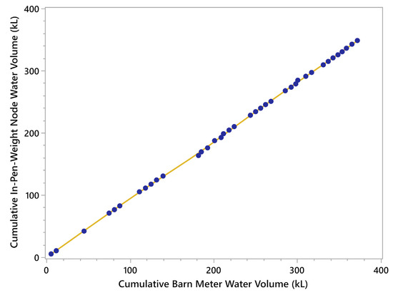 When the total barn water use (as measured by the residential meter) was compared to the total flow measured at the ten In-Pen Weighing Positions plus the occasional use at the frost-free hydrant, the Spearman Rho correlation was strongly positive, ρ = 0.9999, p < 0.0001 (Figure 4). There was parallelism between the lines of best fit for both the cumulative In-Pen Weighing Position volume and the total barn water, based on the Parallelism F-test (F = 0.135, p = 0.714, Figure 5).