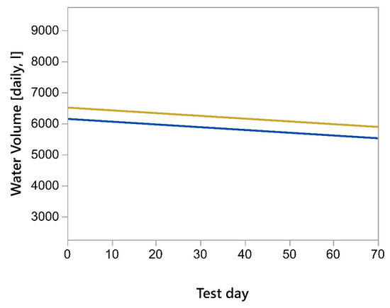 Parallelism plot for the water volume measured by the In-Pen Weighing Position-associated water meters (blue) and the total water volume measured by the barn water meter (gold).